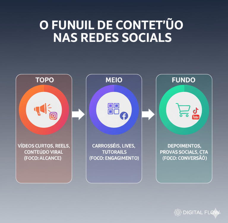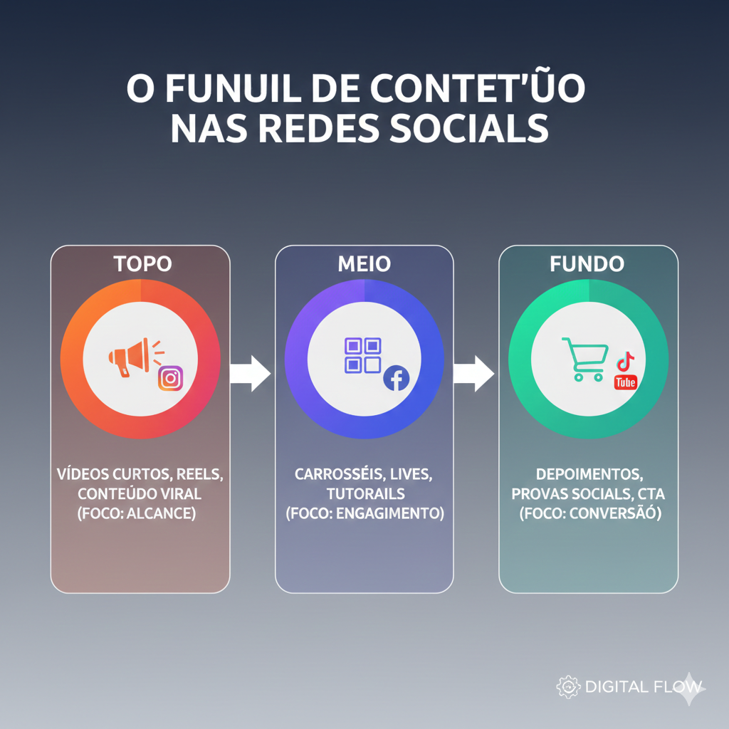 Topo de Funil (Atração): Conteúdos compartilháveis. Reels virais, memes inteligentes, dicas rápidas, opiniões polêmicas (mas saudáveis). O objetivo aqui é o alcance.